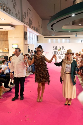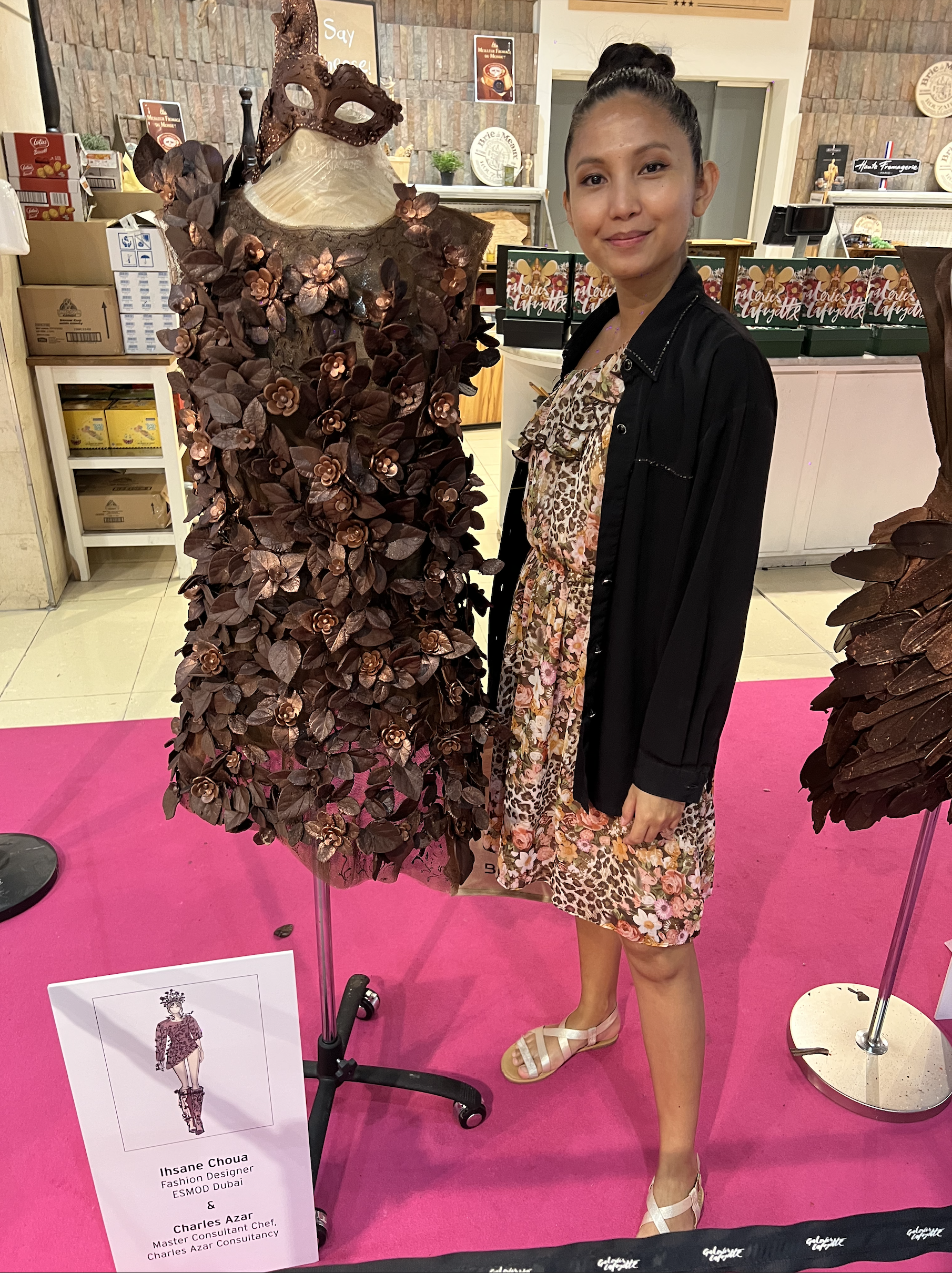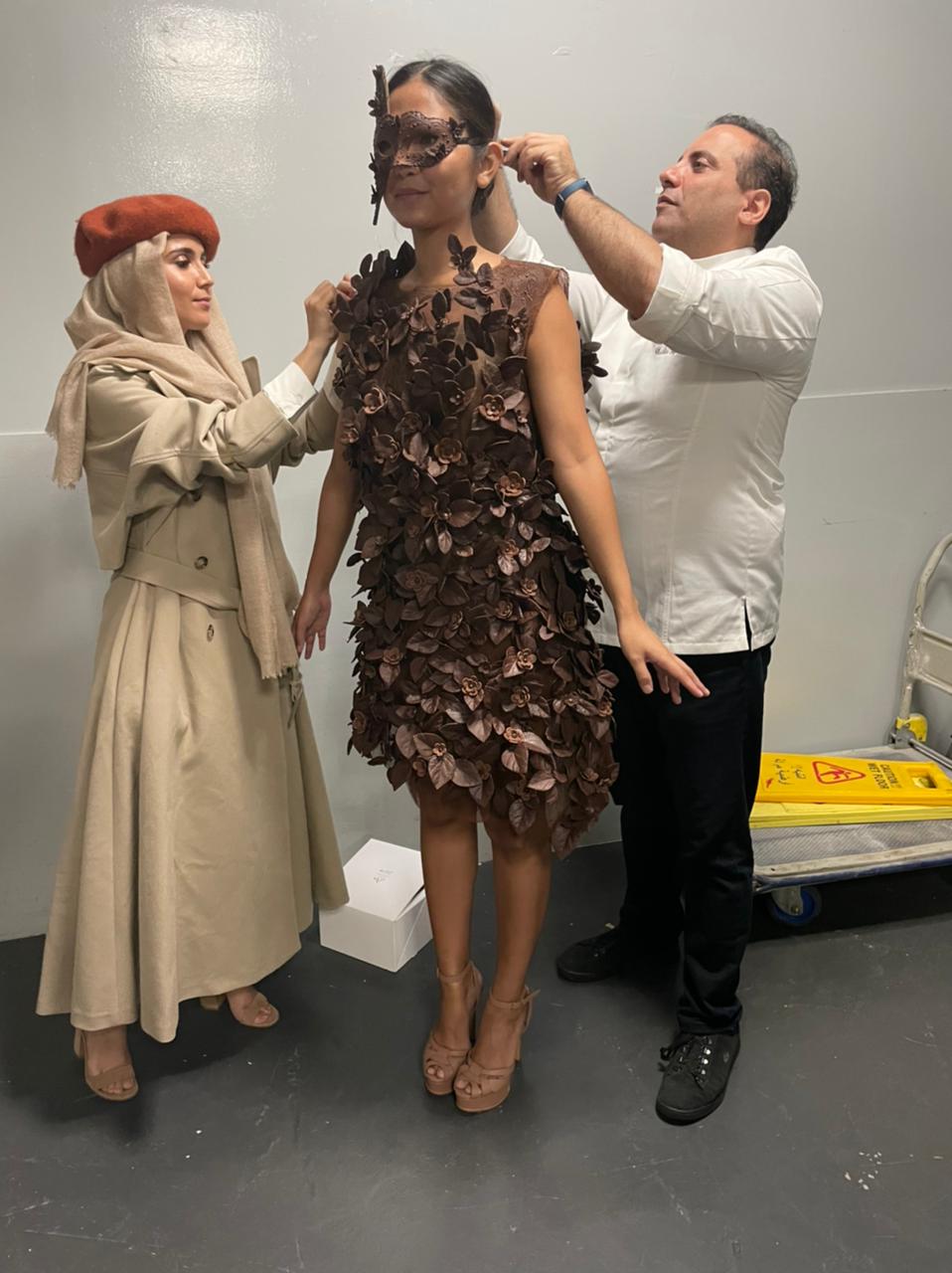 Wearing a Full Dress and eye mask made of 100% Real Edible chocolate! Salon Du Chocolat Fashion Show, Galeries Lafayette Dubai.